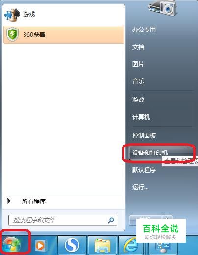 首先,我们点击开始菜单,并点击“设备和打印机”。