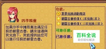 怜悯: ①玩家可接取任务 “兑换天地极乐”,扣除朝云古书×2后,可选嘉奖为7-10级技术书的其中1本,该任务 可以重复完成。 ②玩家可接取任务 “兑换昊天罡气”,扣除朝云古书×3后,可选嘉奖为7-10级技术书的其中1本,该任务 可以重复完成。 ③玩家可接取任务 “兑换圣灵附体”,扣除朝云古书×3后,可选嘉奖为7-10级技术书的其中1本,该任务 可以重复完成。 ④转生玩家可接取任务 “兑换凝神聚气”,扣除朝云古书×3后,可选嘉奖为1-5级技术书的其中1本,该任务 可以重复完成。