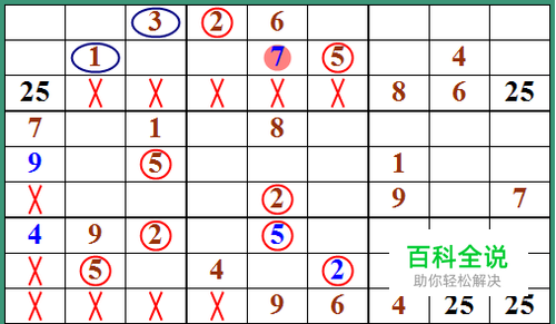 看起来很复杂,不要急,分析一相这些数字是怎么得到呢,还是根据数独的规则,每一个格中的数字,都是表示排除了它所在行、所在列、所在九宫格中出现过的数字,然后剩下的数字都是可能的了,这步是软件自动完成的,实际上在有的数独游戏中,没有提供自动填写候选数的功能,那我们就要根据上面的规则,自己去填写候选数了。 在实际中,我们不需要列出所有的候选数,只是在需要和有可能帮助解题的地方填上候选数,因为填得太多,会感觉比较乱,也会影响我们的思维。 怎么从这些杂乱的数字里发现解题的关键呢,可以按下面的技巧去完成: 观察一行、一列或一个九宫格中的数字,判断是否有某个数在一行或一列或一个九宫格中只有一个可能的位置,那这个数就肯定是在这个位置上了。 很不好找是吧,细心一点,相信你一定可以找到的。 看看下面这张图: 在第四行中,红框所标注的方格里,5在此行内只出现了一次,用鼠标点5,可以把数字5填在此格中。 继续按上面的方法找: 点完数字5后,在红框所示的位置出现了一个单独的7,这表示这个位置只有一个选择,那么点7放入数字7。
