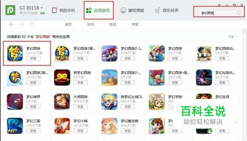 在打开的手机助手的主界面中,点击并切换到“应用游戏”选项卡,接着在应用搜索框中输入想要的游戏应用,例如小编所要下载使用的“梦幻西游”,点击“搜索”按钮即可列出相应的应用,最后点击“安装”按钮即可开始下载并安装该应用。