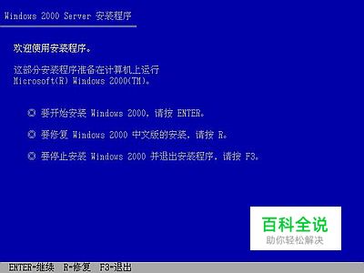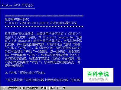 安装Windows 2000 server 光盘自启动后,如无意外即可见到安装界面,将出现如下图所示。这一步有三个选项“1.要开始安装Windows 2000,请按ENTER;2.要修复Windows 2000中文版的安装,请按R3。要停止安装Windows 2000并退出安装程序,请按F3”在这里我们选第一项按“Enter”键回车,出现下图所示。许可协议,这里没有选择的余地,按“F8”。这里用“向下或向上”箭头键选择安装系统所用的分区,选择好分区后按“Enter”键回车,安装程序将检查所选分区,如果这个分区己经安装了另一个系统会出现下图。要使用所选的分区安装,按“C”键。这里对所选分区可以进行格式化,从而转换文件系统格式,或保存现有文件系统,有多种选择的余地,但要注意的是NTFS格式可节约磁盘空间提高安全性和减小磁盘碎片但同时存在很多问题OS和98/Me下看不到NTFS格式的分区(这儿既然是Server,个人强烈推荐选择NTFS),在这里选“用FAT文件系统格式化磁盘分区”,按“Enter”键。 格式化所选分区C盘的警告,按F键将准备格式化c盘。由于所选分区C的空间大于2048M(即2G),FAT文件系统不支持大于2048M的磁盘分区,所以安装程序会用FAT32文件系统格式对C盘进行格式化,按“Enter”键回车。只有用光盘启动或安装启动软盘启动Windows 2000安装程序,才能在安装过程中提供格式化分区选项;如果用MS-DOS启动盘启动进入DOS下,运行i386winnt进行安装Windows 2000时,安装Windows 2000时没有格式化分区选项。格式化C分区完成后,安装程序开始从光盘中复制文件。复制完文件后,复制完文件后系统将会自动在15秒后重新启动,这时要注意了,请在系统重启时 将硬盘设为 第一启动盘或者临时取出安装光盘启动后再放入,使系统不至于进入死循环又重新启动安装程序。 重新启动后,首次出现2000启动画面。启动后开始检测设备和安装设备,其间会黑屏二次,这是正常的,完成后出现如下图所示。区域和语言设置选用默认值就可以了,直接点“下一步”按钮。这里任意输入你想好的姓名和单位,点“下一步”按钮。如果你没有预先记下产品密钥(安装序列号)就大件事啦!这里输入安装序列号如∶H6TWQ-TQQM8-HXJYG-D69F7-R84VM,点“下一步”按钮。在这里你可以根据需要任选一项,想配置成服务器选第一项,配置成工作站选第二项(同Windows 2003一样),选择后按“下一步”。计算机名称自己任意输入默认作为服务器名,输入两次系统管理员密码,请记住这个密码,登陆时用。 出现组件选项,根据需要选择,亦可以在安装完成后可在添加/删除里更改,点“下一步”继续。日期和时间设置不用讲了,点“下一步”,接着开始安装网络。网络设置选“典型”即可,点“下一步”。点“下一步”,开始安装组件、保存设置、删除用过的临时文件。点击“完成”按钮完成全部安装过程,系统重新启动。 按Ctrl+Alt+Delete组合键启动系统。输入你安装时设置的密码。如果你不想配置你的服务器,可以以后再配置,直接点“下一步”,将出现桌面。将“启动时显示该屏幕”前面的勾取消,下次启动就不会出现该窗口了,直接关闭窗口。Windows sever 2000启动成功。