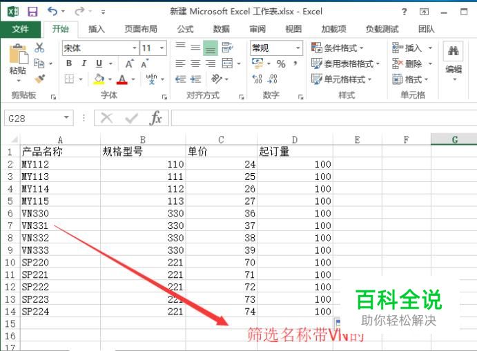 首先我们打开Excel软件并准备一个数据表,如下图所示,下面要筛选出名称中带VN的