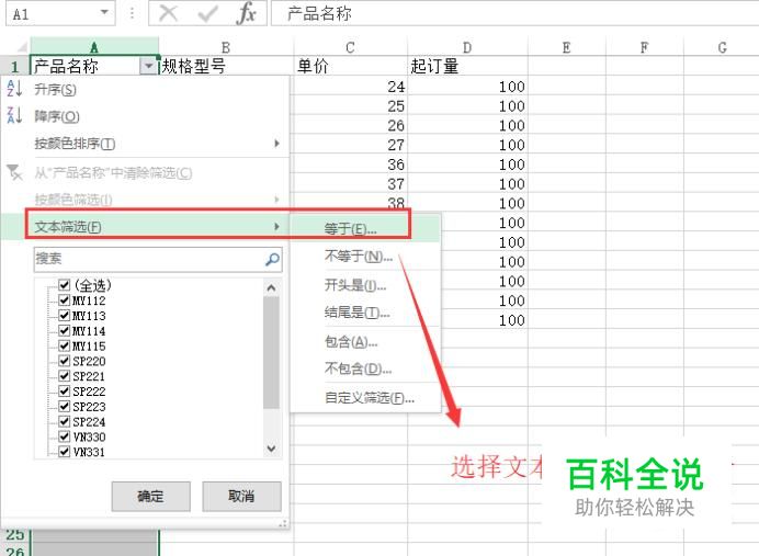 接下来我们点击名称标题单元格右上角的箭头,在弹出界面中选择文本筛选下的等于选项,如下图所示