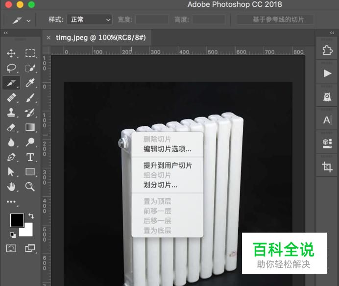 打开图片之后,在左侧选择“切片工具”,然后点击右键,选择“划分切片”