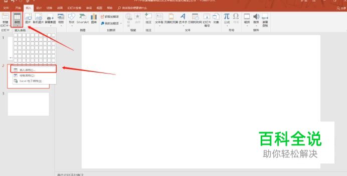 首先使用office工具新建Powerpoint(ppt),在PPT种插入表格可以参考如下方式:在工具栏选择”插入”---“表格”,点击下面的箭头会出现下拉菜单,下拉菜单中可以直接绘制需要的表格,也可以选择插入表格,如图2,设置需要的行数和列数生成表格。(本文采用的是插入表格,设置行数和列数的方式)