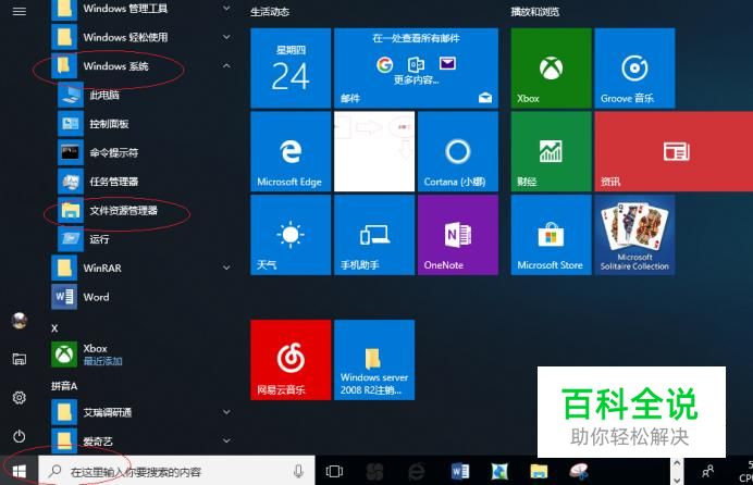 点击任务栏"开始"按钮,弹出开始菜单选择"Windows 系统→文件资源管理器"项。