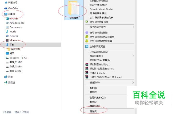 如鼠标右击"此电脑→下载→实验报表"文件夹,弹出快捷菜单选择"属性"项。