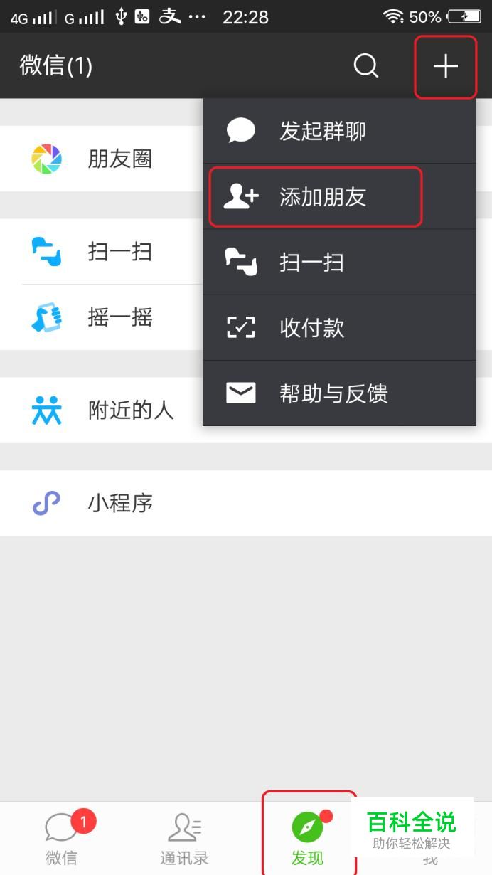 首先,我们打开微信,如图所示,我们点击右上角的“+”,弹出菜单,选择“添加朋友”。