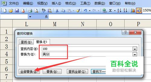 单击编辑---替换,查找内容填100,替换为填满分,单击全部替换。