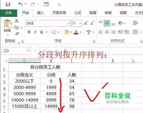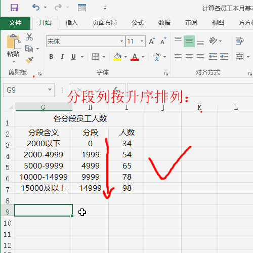 然后我们正确的输入lookup函数,第一个参数G9是我们查找的值,第二个参数,是我们对比的区域:分段列,第三个参数是我们返回的区域:人数列,如下图所示: