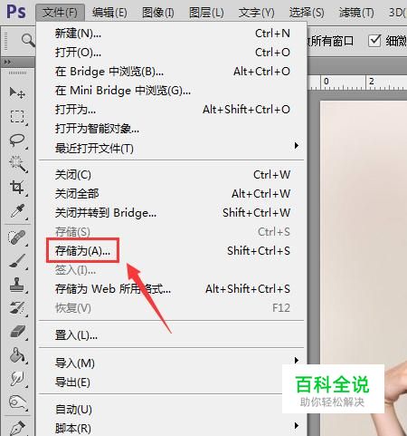 打开图片之后我们在文件菜单里找到存储为选项,如图所示: