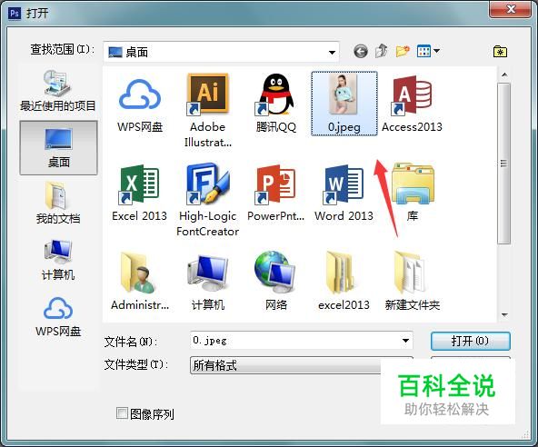 打开ps我们按下Ctrl+O键在弹出的对话框内找到我们的jpeg格式的图片,如图所示:
