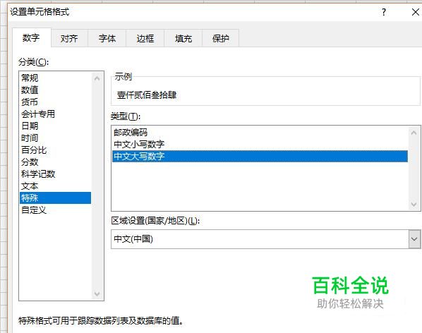 在弹出的界面中选择特殊下面的中文大写数字,如下图所示