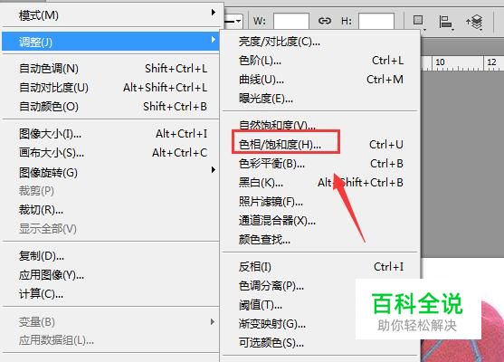 点击调整选项在其下拉菜单那里找到色相饱和度选项,如图所示: