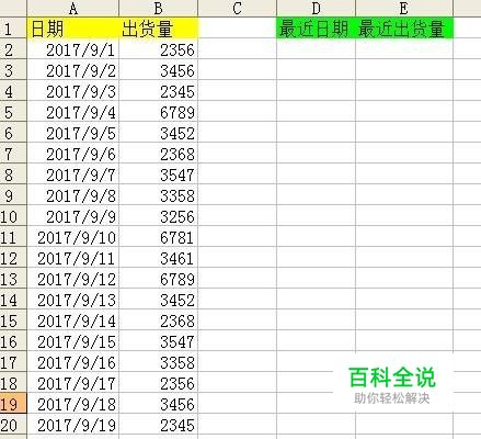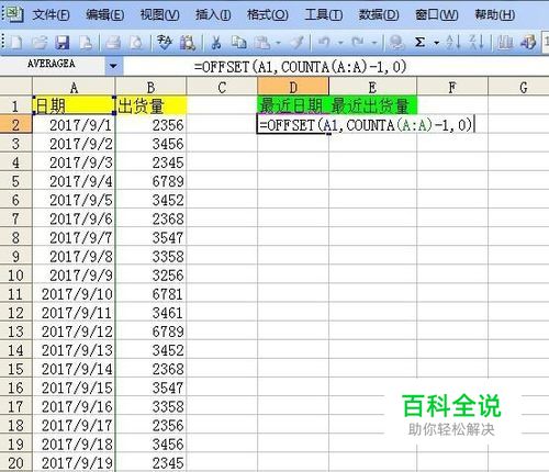 日期引用完毕,再来引用出货量,两种方法,一是在E2中输入:=OFFSET(B1,COUNTA(B:B)-1,0)。