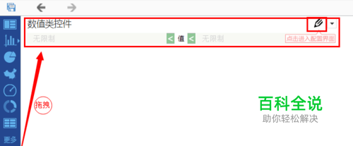 添加数值类控件 新建一个模板,命名为数值类控件,在弹出的DashBoard界面的右侧工具栏中拖拽一个数值类控件。点击右上角的,进入详细设置页面。如图:
