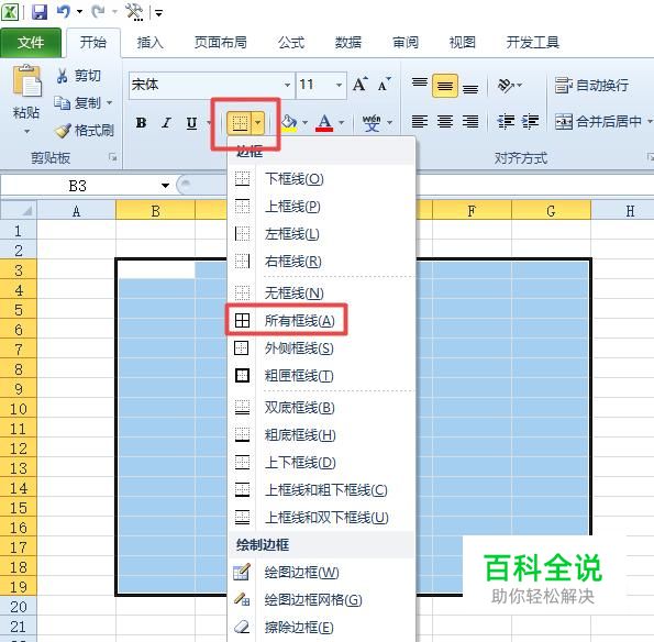 然后我们点击边框按钮边上的下拉箭头,弹出的界面,我们点击所有边框;