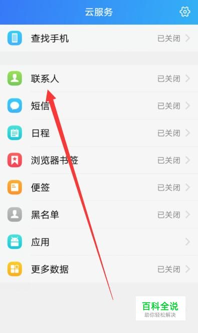 在手机恢复出厂设置之后,登录云服务账户,选择“联系人”,点击并进入,如图所示。