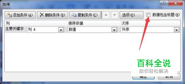 弹出排序对话框,如果数据表中第一行要作为标题,则勾选右侧的数据包含标题。