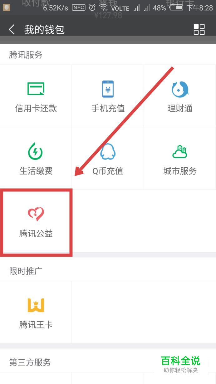 进入到【钱包】后,往下翻,在界面中找到【腾讯公益】,点击进入。