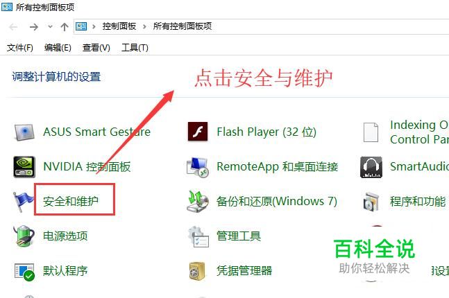 接下来进入控制面板以后,点击安全和维护选项,如下图所示