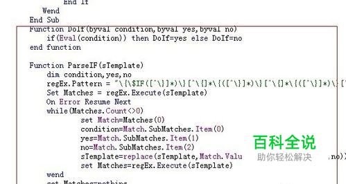 搜索Function Parse(sTemplate, iPosBegin) 在这段上面插入以下代码 Function DoIf(byval condition,byval yes,byval no) if(Eval(condition)) then DoIf=yes else DoIf=no end function Function ParseIF(sTemplate) dim condition,yes,no regEx.Pattern = “\{\$IF([^\}]*)\}[^\{]*\{([^\}]*)\}[^\{]*\{([^\}]*)\}[^\{]*{/\$IF\}” Set Matches = regEx.Execute(sTemplate) On Error Resume Next while(Matches.Count<>0) set Match=Matches(0) condition=Match.SubMatches.Item(0) yes=Match.SubMatches.Item(1) no=Match.SubMatches.Item(2) sTemplate=replace(sTemplate,Match.Value,DoIf(condition,yes,no)) set Matches=regEx.Execute(sTemplate) wend set Matches=nothing ParseIF=sTemplate end Function 如图: