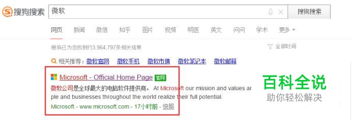 通过检索工具搜索“微软”,选中官方网站进入。