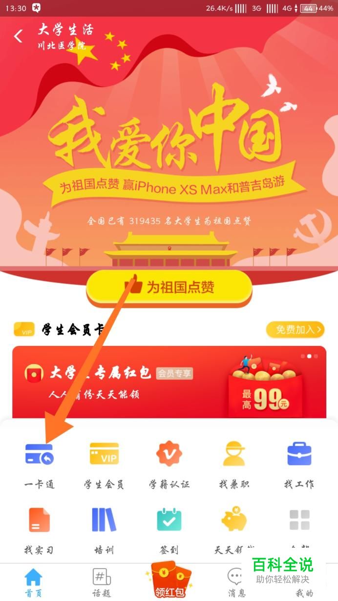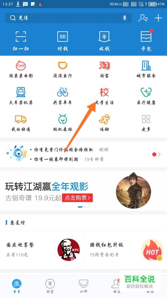 打开手机的支付宝,如果没有就注册一个,点击主页的“大学校园”,如图所示。