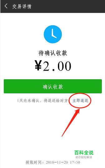 点击转款,刚点击时不会立马收款的,转账是需要二次点击才会收款到自己的钱包;打开之后我们可以看到下方有个“立即退还”,点击这个。