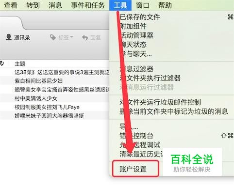 要启用反垃圾邮件功能 ,我们点击菜单栏上的‘工具’,弹出下拉,点击‘账户设置’