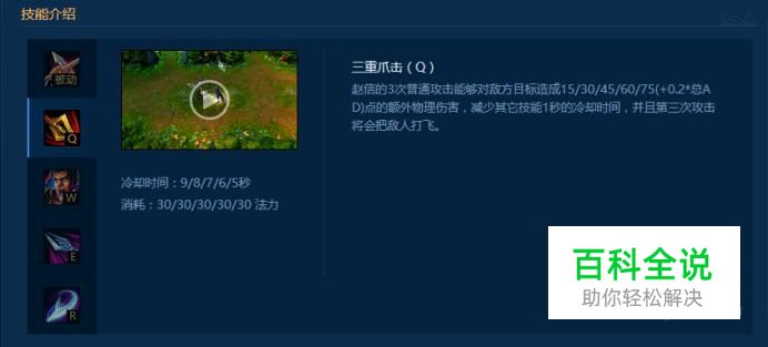 赵信的被动战个痛快,期间3秒对目标发起挑战降低目标15%护甲,持续3秒。Q技能三重爪机,使接下来三次普通攻击对敌方造成更大伤害,减少其他技能1秒,第三次普攻击飞对方。W技能没三次普攻获得一次暴击并回复生命值。E技能冲向敌方,小范围产生对敌方的伤害并减速。R技能手中长枪挥舞一圈,对周围敌人产生伤害并将其击退,根据命中数获得护甲魔抗加成。