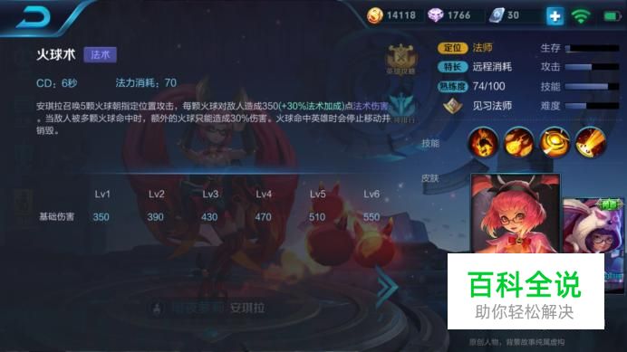 一技能:火球术 (1)技能解析:安琪拉能够召唤五个火球朝指定方向攻击给敌人造成伤害。 (2)使用技巧:该技能是非常考验玩家的预判能力的,最佳效果是五颗火球同时命中敌人才能把伤害最大化。对于初学者,小编建议大家多打几场人机练练手感。