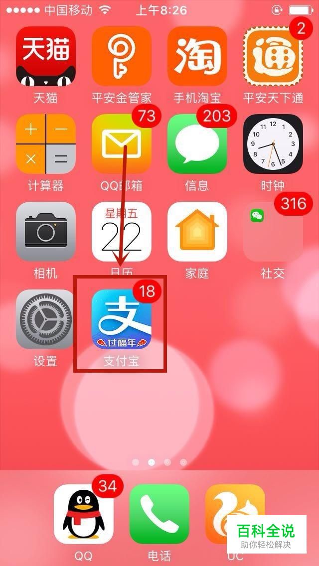 首先在手机桌面上找到支付宝并点击它,如下图所示。