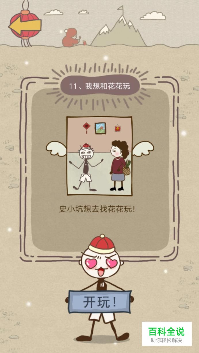第十一关:我想和花花玩。 点击提示,就会出现“去和花花玩”,点击“去和花花玩”就可以去玩了,这一关是不是很容易(哈哈)。