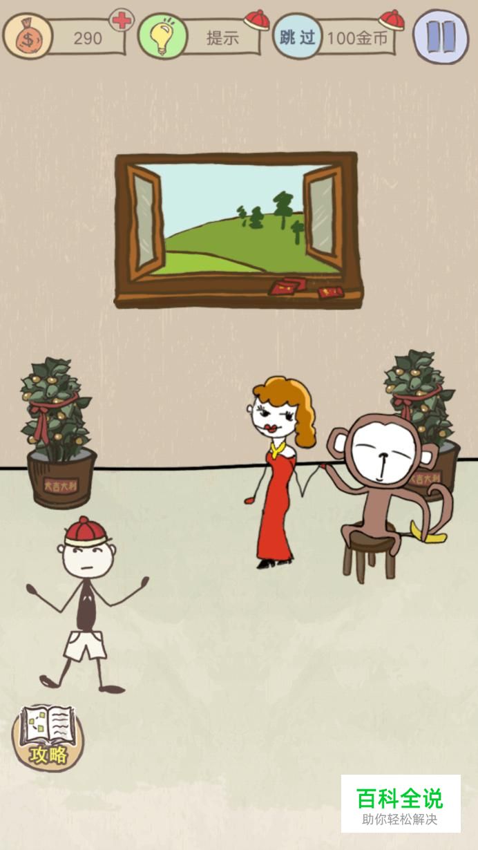 第二十关:调皮猴子。 摇晃手机,猴子的香蕉就会掉地上,然后点击香蕉,将香蕉扔出窗外,猴子就回去捡香蕉,史小坑就能跟美女好好相处啦!