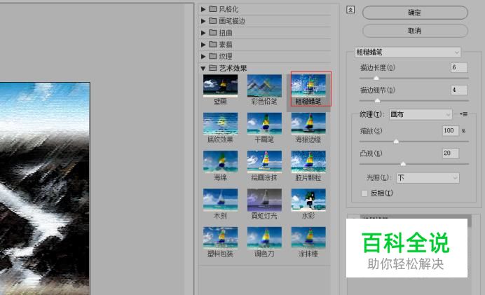 垂直翻转画布;然后,从滤镜库里面找到“艺术效果”里面的“粗糙蜡笔”,选择并设置如图所示参数。