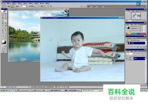 选择“移动工具”=》在人物图片上按住左键不放,然后拖动图片,当移动工具显现在风景图片中时松开左键,人物图片就移到风景图片中了,下图就是人物图片移动到了风景图片中,不过人物图片比风景图片大,盖着了风景图片;