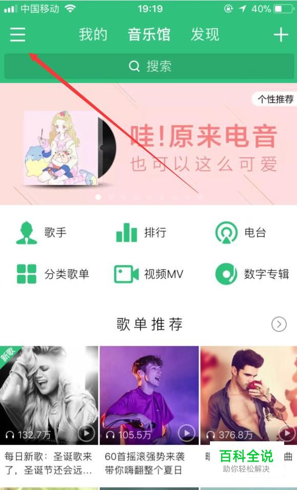 打开QQ音乐进入主页,单击面板左上角的三横图标按钮。