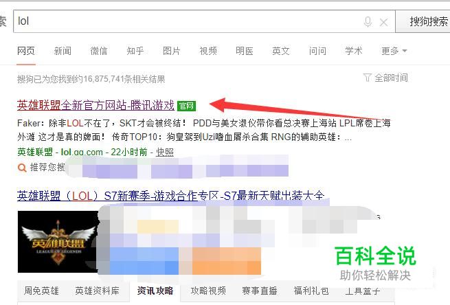 首先打开搜狗输入“lol”,然后进入lol官方网站,这里千万要注意后面绿色的官方标志哦,小心进入虚假钓鱼网站。