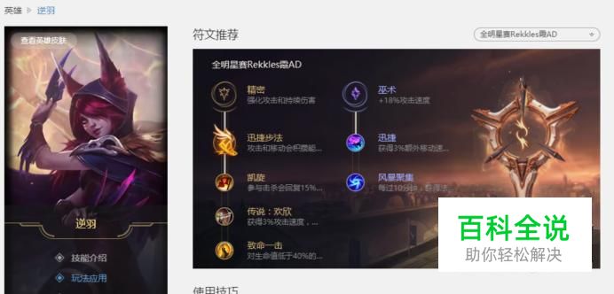 主符文加点推荐:精密,因为逆羽是一个AD射手,主符文点精密可以使其普通攻击伤害更高。