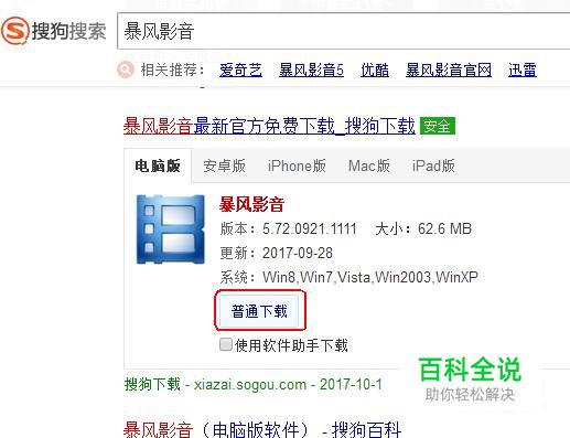 使用搜狗搜索引擎搜索关键词“暴风影音”