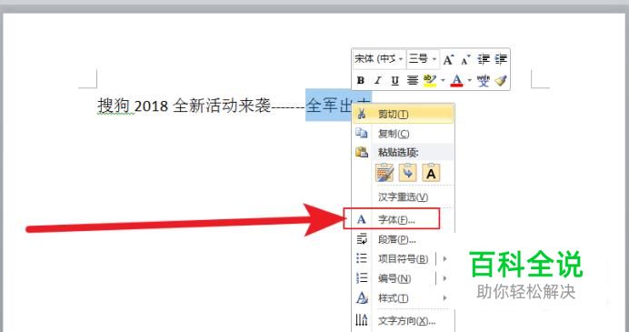 选中几个字,例如‘全军出击’,点击鼠标右键,选择字体;