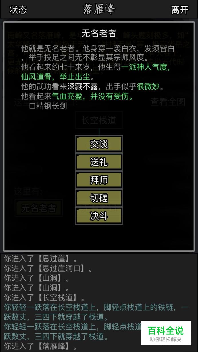 最后一步成功拜师,就是要回到主页面上,进去师门,然后找到无名老者拜师,这样他就可以教你剩下的武学了,也就是华山顶级武学——独孤九剑。
