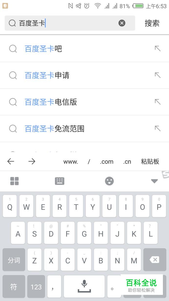 打开手机浏览器,在百度搜索输入框里输入“百度圣卡”。