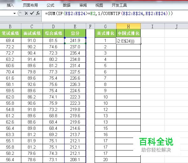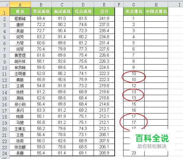 为方便大家观看和理解美式排名,例表中已将总分降序排列好了,从表中可以看到有2位考生并列第10名、2位考生并列第13名,3位考生并列第17名,美式排名并列排名占用位数,所以下一个名次分别是第12名、第15名以及第20名。