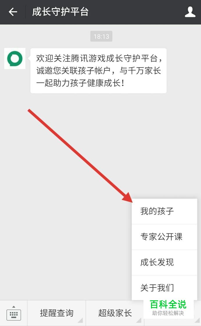 关注成功后会进入成长守护平台的公众号,然后我们点开右下角的“我”,接着选择我的孩子(如图所示)。
