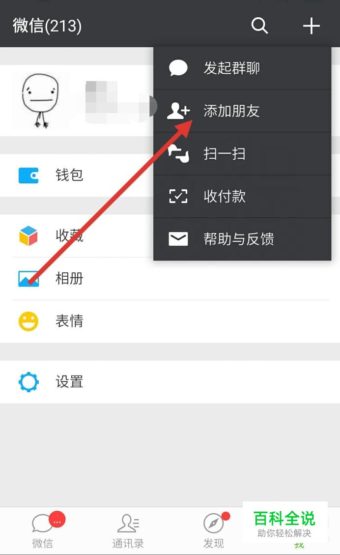 首先我们打开微信,然后点击右上角的“+”号,选择添加朋友(如图所示)。