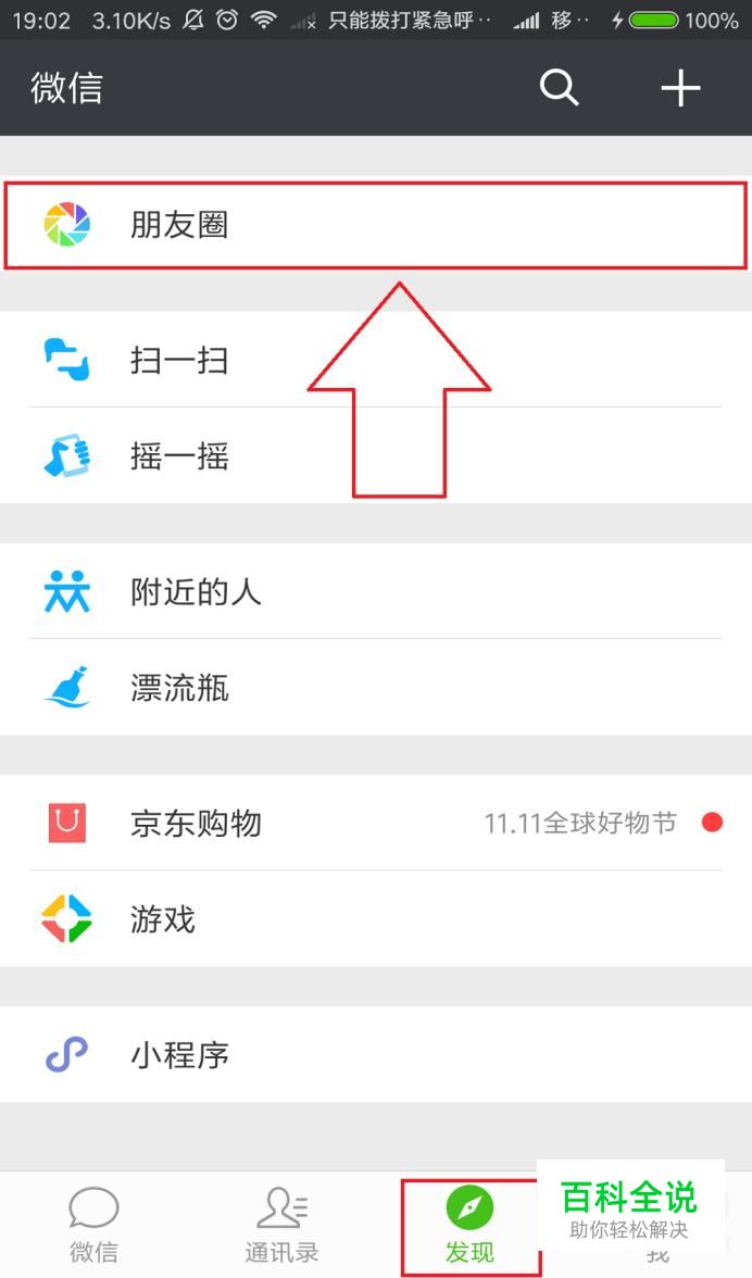 打开微信后在下方点击“发现”并进入“朋友圈”。