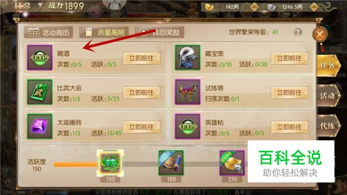 进入活动界面,点击“喝酒”立即前往,每日可参与5次活动,完成后可获得5点活跃度。