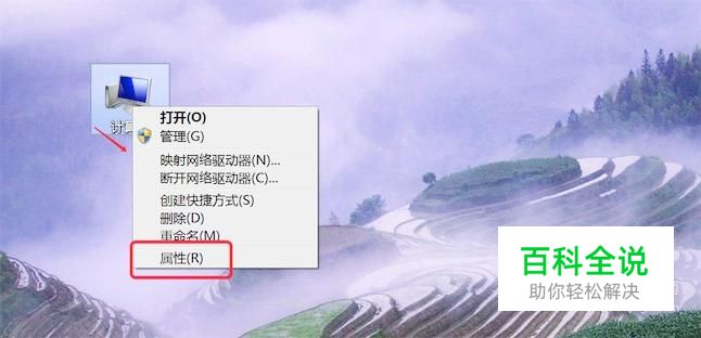 右键点击桌面上的‘计算机’,在弹出菜单上点击‘属性’